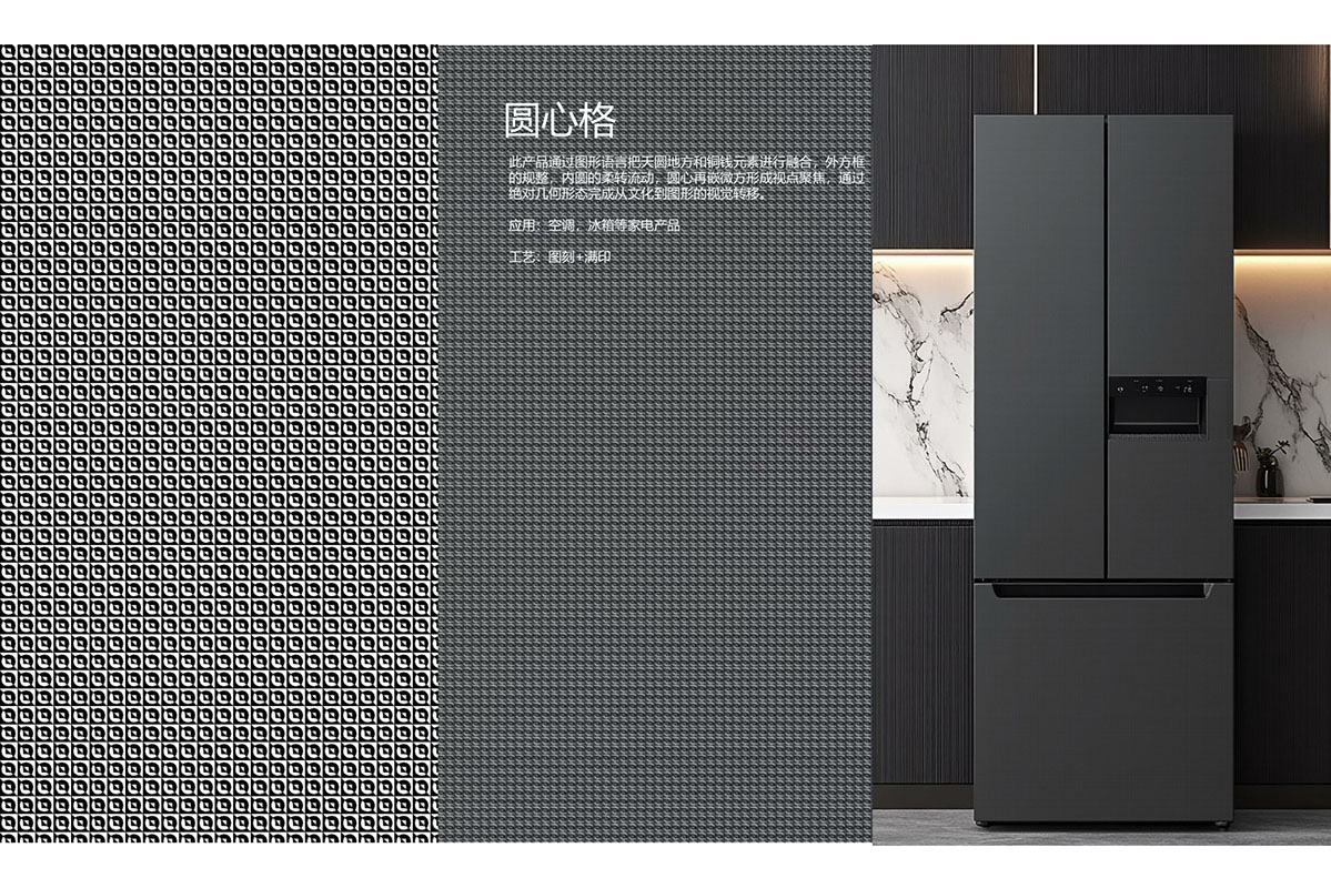 超细腻的网眼和微网孔结构与几何形态重叠。灵活多变的几何图案,通 过数学函数的计算,体现出家电的未来感和科技感。