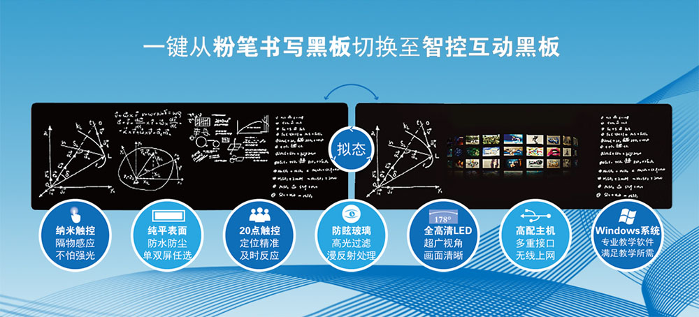 画面清晰度好,能在阳光下完美工作!操作简单:不需要计算机知识;书写流畅:笔随手动,任意书写,笔划流畅;互动展示:可在交流课件上随意标注讲评 ;课件丰富:课件可以为ppt ,pdf,word等。触摸无延迟,轻松实现手写文字,绘图,加注等功能!玻璃防眩效果给力!