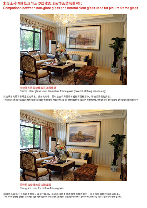 未经玉砂防眩处理与玉砂防眩处理装饰画玻璃的对比